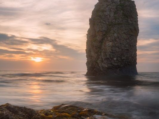Рассвет с видом на кекур Чёртов палец в бухте Головнина. Влажный воздух, мягкий свет, запах водорослей, шум моря — лучшее утро, которое только может произойти.